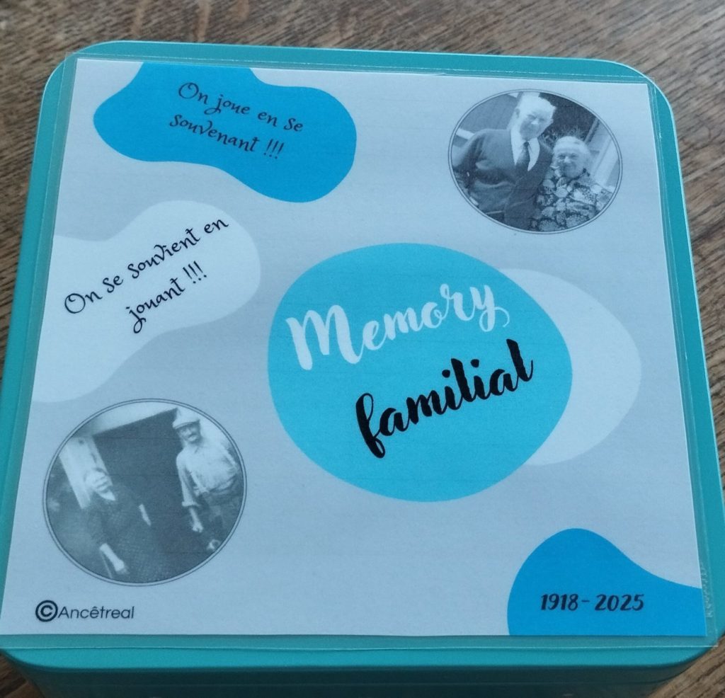 Rien de bien compliqué (mais je ne cache pas que cela m’a pris beaucoup de temps 🙂 . J’ai détourné mon jeu de mémory des années 70 en collant des photos (par paire) de notre famille. Des très récentes comme des très anciennes, avec en guise de clin d’oeil la photo de mariage de notre fille en 2025 et celle de nos grands-parents en 1918 ! Comme le verso des cartes n’était pas très reluisant, je l’ai recouvert de papier mauve sur lequel j’ai appliqué du vernis colle.