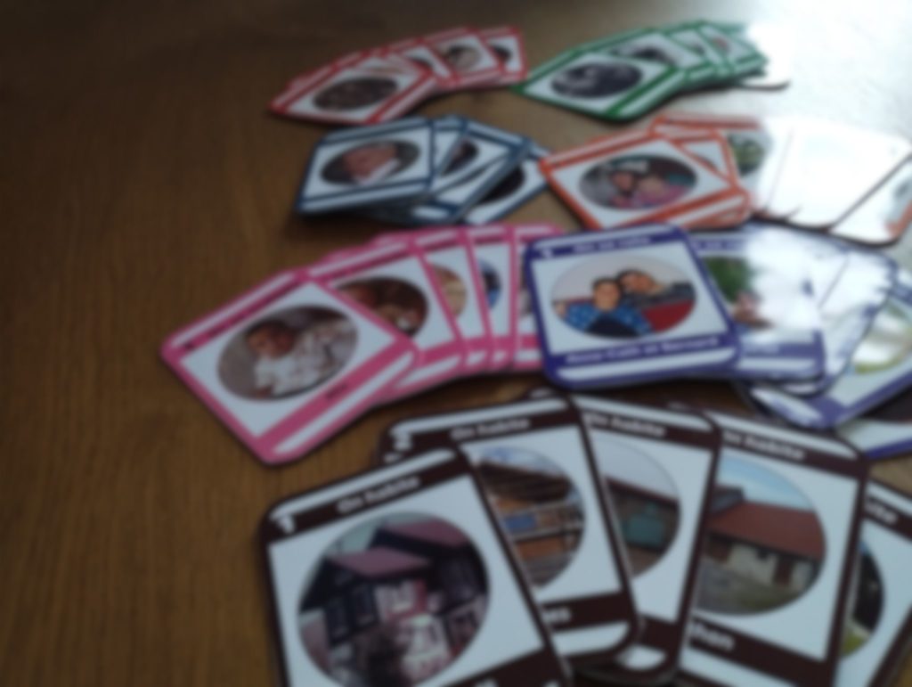 Pour concevoir l’ensemble de ces jeux, j’ai utilisé Canva en détournant des modèles existant sur l’outil (notamment pour le jeu de cartes et de loto). Le plus long a été de sélectionner les différentes photos dans mes fichiers et, si besoin, d’en numériser d’autres. Après insertion des photos sur mon modèle Canva, j’ai imprimé les feuilles format A4 sur du papier photo. Ensuite, il a fallu mettre mes petites mains en action, c’était le plus fastidieux : découpage, collage… collage, découpage… ajustements. Il y a eu beaucoup de râtés et de rétrogradages… Une nouvelle occasion pour moi de vérifier le fameux adage ressassé par ma grand-mère : « faire et défaire, c’est toujours travailler »…