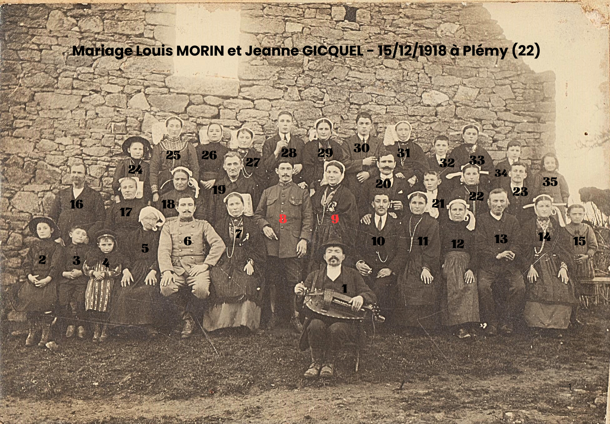 Mais venons-en au fait : que voit-on sur cette photo ? Deux mariés dont l’identité ne fait aucun doute : lui, Louis MORIN (8), notre grand-père, alors âgé de 27 ans, elle, Jeanne GICQUEL (9), notre grand-mère, qui n’a pas encore 24 ans. La photo a été prise entre le 15 décembre (mariage civil) et le 17 décembre 1918 (mariage religieux). On est à Plémy, un tout petit village de la région du Penthièvre (Côtes d’Armor). D’où les coiffes et les habits traditionnels (coiffes qui, soit dit en passant, ne facilitent pas l’identification).